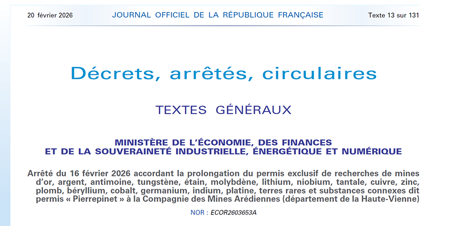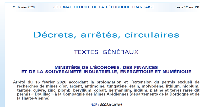 En février 2026, l’État a accordé à la Compagnie des Mines Arédiennes la prolongation pour 5 ans et l’extension sur une superficie d’environ 298 km² du PER Douillac et l’extension pour 5 ans du PER Pierrepinet.