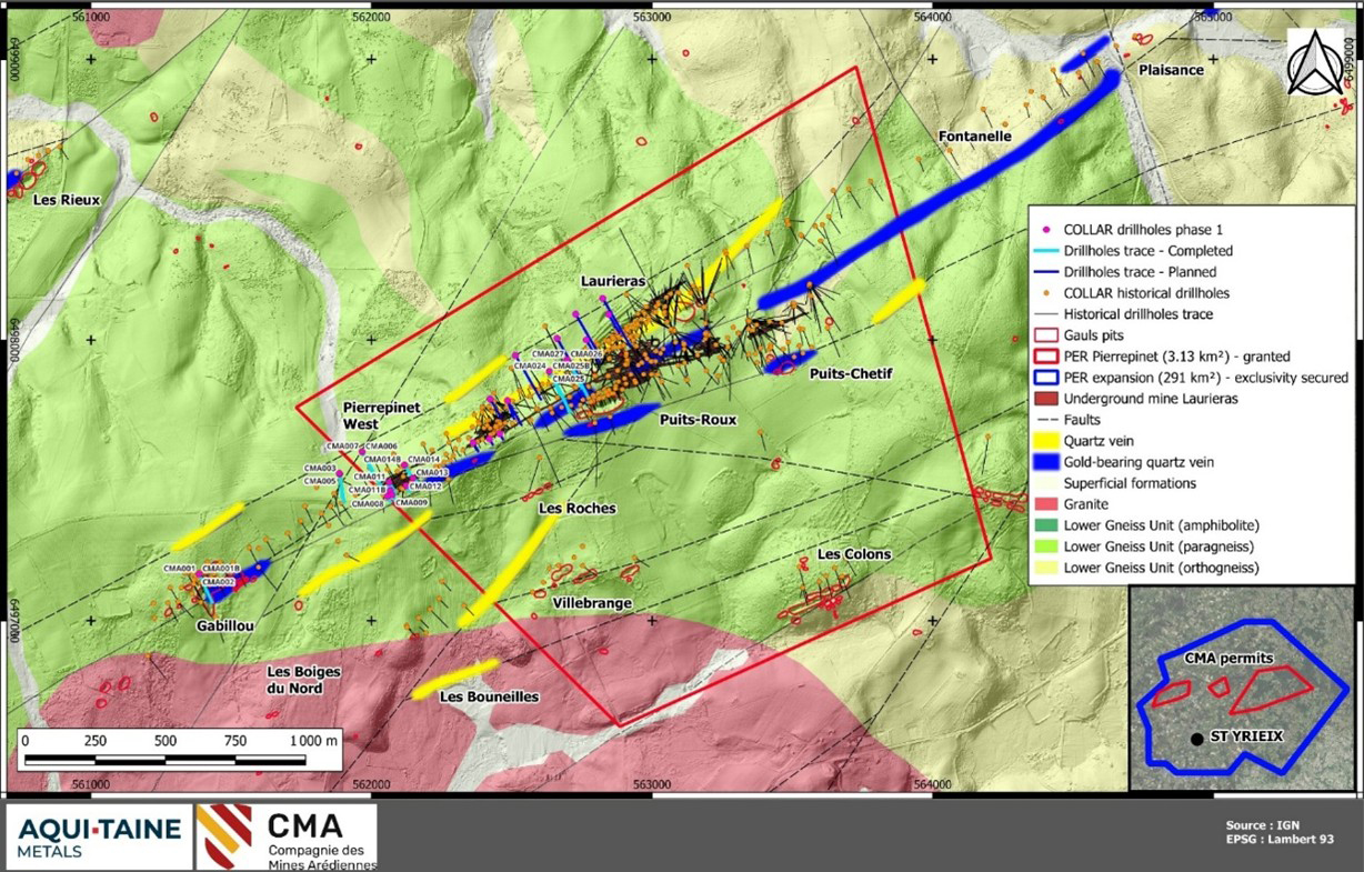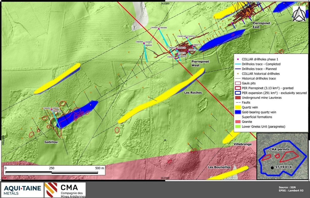 20 octobre 2025 – Limoges, France – Aquitaine Metals Corp. et la Compagnie des Mines Arédiennes (CMA) publient les premiers résultats des sondages réalisés sur le projet de recherches polymétalliques situé au sud de Limoges, en Haute-Vienne. Ce projet comprend un programme de sondages, lancé en février 2025, qui prévoit 8 800 mètres de longueur cumulée répartis sur 44 sondages.