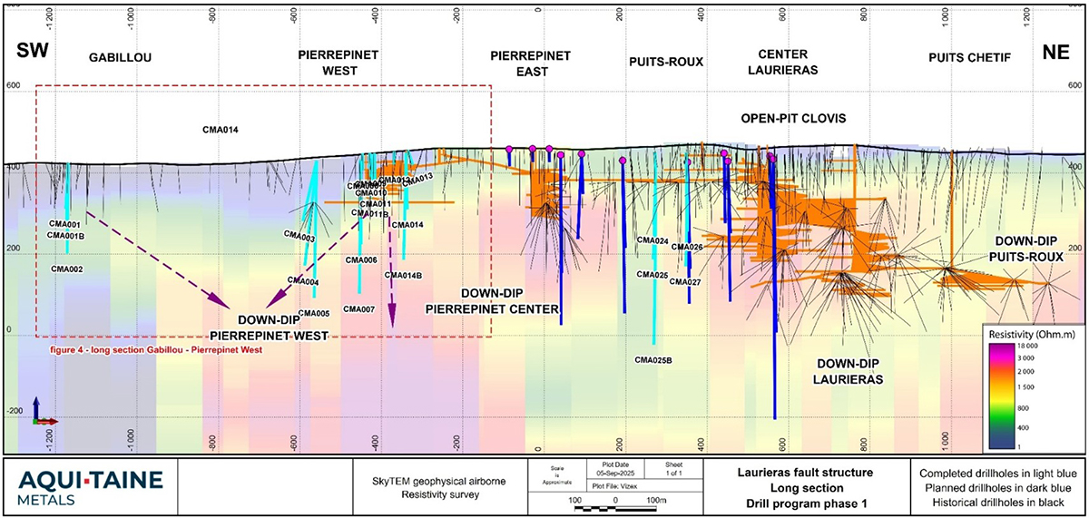 Figure 3 Coupe longitudinale SO-NE montrant l’avancement du programme de sondage de phase 1 sur la structure faillée de Laurieras. L’emplacement de la Figure 4 est indiqué par le contour rouge.