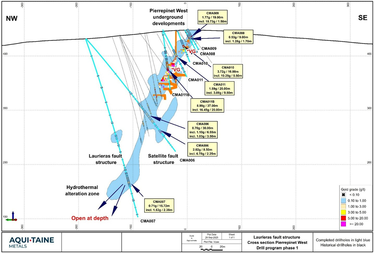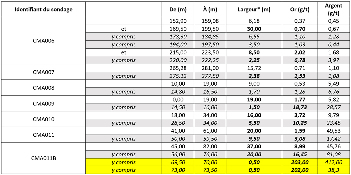- Le meilleur résultat a été de 16,45 g/t d’or sur 20,00 mètres, comprenant 2 intervalles à haute teneur de 203 g/t d’or sur 0,50 mètre et 202 g/t d’or sur 0,50 mètre, tous situés dans un large intervalle affichant une teneur moyenne de 8,99 g/t d’or sur 37,00 mètres (sondage CMA011B).