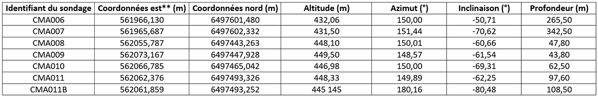 Des sondages plus profonds confirment le potentiel d’une minéralisation aurifère importante à des profondeurs supérieures à celles connues auparavant. Le sondage CMA006 a recoupé 6,78 g/t d’or sur 2,25 mètres à une profondeur de 65 mètres sous l’ancienne mine de Laurieras. Les résultats et les emplacements des sondages sont résumés respectivement dans les Tableau 1 et Tableau 2.