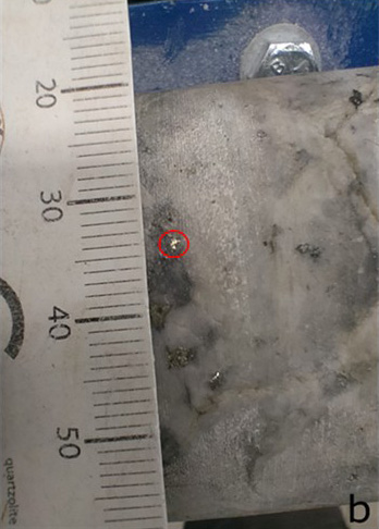 or visible dans veine de quartz multiphasée blanche et grise à – 600 m dans l’extension latérale sud-ouest du dernier niveau minier souterrain à Pierrepinet Ouest, de 81,40 à 82,40 m.